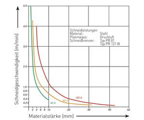 Schneidleistung, Schnittgeschwindigkeit und Stromstärke hängen voneinander ab. Die Grafik zeigt den Zusammenhang von Schneidleistung zu Schneidgeschwindigkeit für verschiedene Stromstärken.