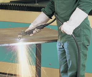 Das Plasma-Schneiden mit Druckluft als Plasma gas ist eine wirtschaftliche Alternative zum Autogen-Schneiden. Mit Plasma-Schneidanlagen kann man sämtliche elektrisch leitfähigen sowie lackierten und galvanisierten Metalle, wie z.B. Baustähle, hochlegierte Chrom-Nickel-Stähle, sämtliche gehärteten und ungehärteten Werkzeugstähle, Aluminium, Aluminium-Legierungen, Messing, Kupfer, Grauguss oder Titan schneiden. Plasma-Schneid anlagen finden vielfältige Einsatzmöglichkeiten in den Bereichen Stahlbau, Montage, Reparatur, Kfz- Sektor, etc.. Der Erfolg des Plasma-Schneidens basiert auf der Eigenschaft des Plasmastrahls (Lichtbogen), im Werkstück einen extrem intensiven und eng begrenzten Wärmefluss zu erzeugen. Die Temperatur des Lichtbogens beträgt dabei ca. 13.000 °C. Das Einbringen der Wärme in das Werkstück erfolgt somit sehr schnell, so dass die seitliche Wärmeableitung im Verhältnis dazu gering bleibt. Durch diese Wärmekonzentration, die einer Energiestromdichte von ca. 106 W/cm2 entspricht, entsteht eine schmale und saubere Schnittfuge. Der Wärme verzug der Werkstücke ist sehr gering. Plasma-Schnitte, die mit hoher Geschwindigkeit ausgeführt werden und schmale Schnittfugen aufweisen, zeichnen sich aus durch: