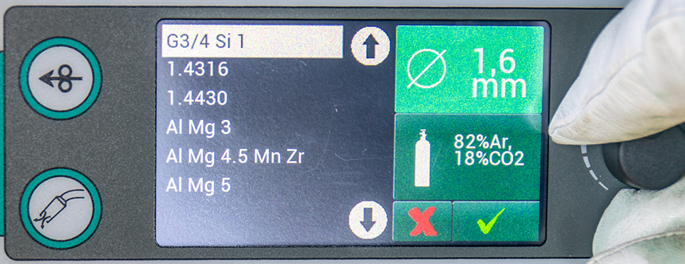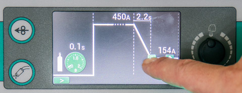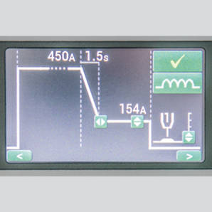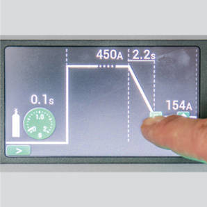 Drosselwirkung, Drahtrückbrand, Gasnach- und Gasvorströmzeit sowie Startstrom und Absenkzeit sind einstellbar.